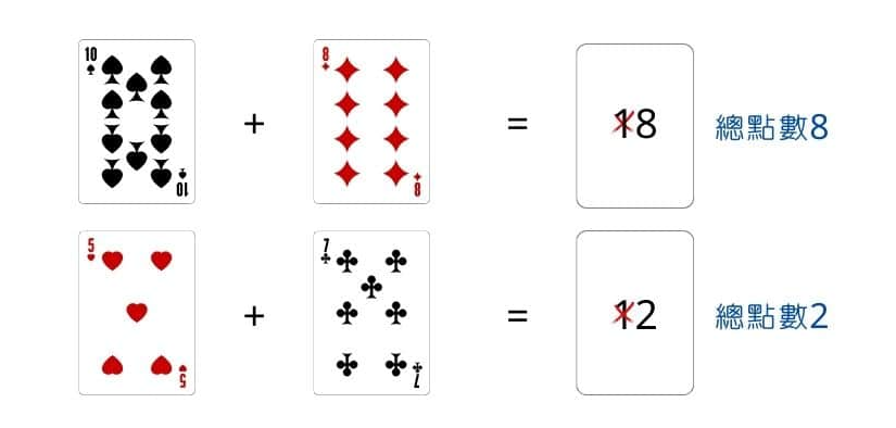Mỗi bên (Nhà Cái và Người Chơi) được chia hai lá bài từ bộ bài chuẩn. Các lá bài từ 2 đến 9 có giá trị bằng với số trên lá bài, trong khi các lá bài 10, J, Q, K được tính là 0, và lá Át có giá trị là 1. Nếu tổng điểm của hai lá bài lớn hơn 9, thì chỉ số hàng đơn vị của tổng đó được tính (ví dụ, nếu tổng là 14, thì điểm của ván chơi sẽ là 4).